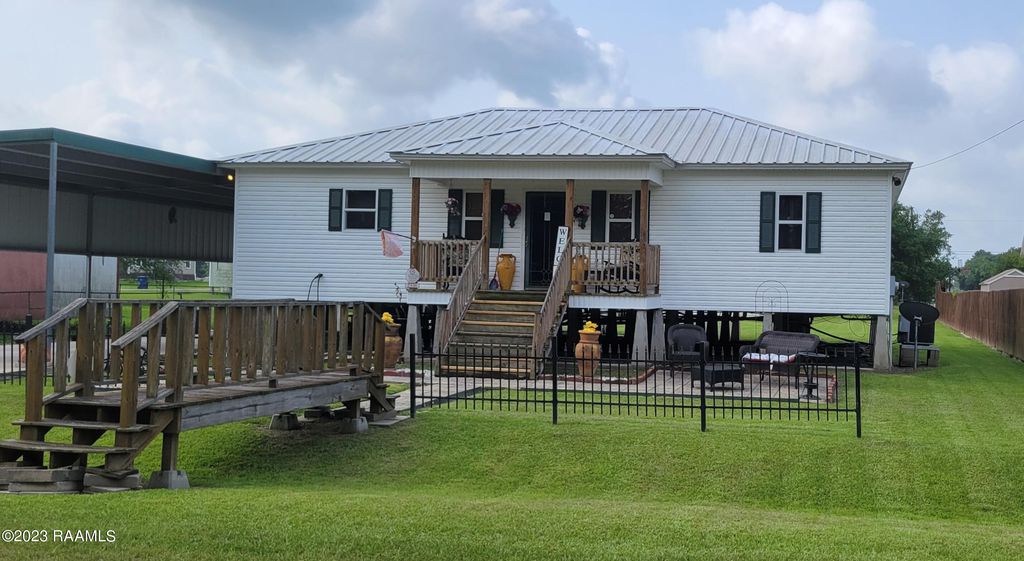 Two houses in one. Who would have thought? Yes this does exist in Abbeville LA.One half of the home is a 3 bedroom 2 bath, living room, laundry and kitchen. The 2nd half of the home is a huge flex space with 1/2 bath, kitchen w/pantry, and living. (ENDLESS POSSIBILITIES) Home theater/huge living or a place to run a business. The home is on a private road w/plenty of parking. Lot approx 126 x 75. The carport is covered and you could fit a couple of car under it. There is also a storage shed the seller is including in the sale.